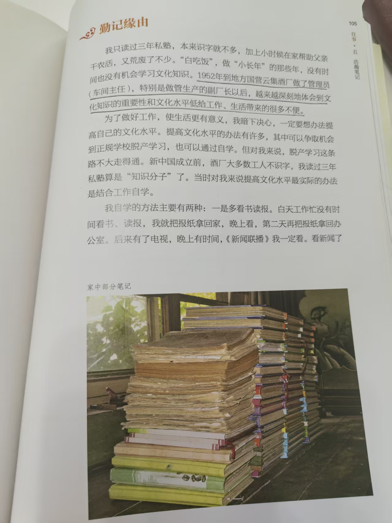 人与人之间的区别,第一个是勤奋,或者说积极主动,第二个是会思考,或者说是学习力,后者对人的进步产生作用更大。王阿牛先生的工作,也是平常的工作,他的经历,也是非常普通:出生于普通的家庭,只读过三年私塾,但他可以说是黄酒行业留下笔记最多的人,他一生留下了105本笔记,有1000多万字。他说只要见到自己感觉新鲜、对提高酿酒技术和领导管理有帮助的内容,他就随手把它记下来。通过记录,原来认识后来忘记的字重新认识了,原来不认识的字也逐渐认识了。通过记录他人介绍的好做法、好经验,以及自己的工作体会与经验,这都为他整理编写各类书籍打下了基础。