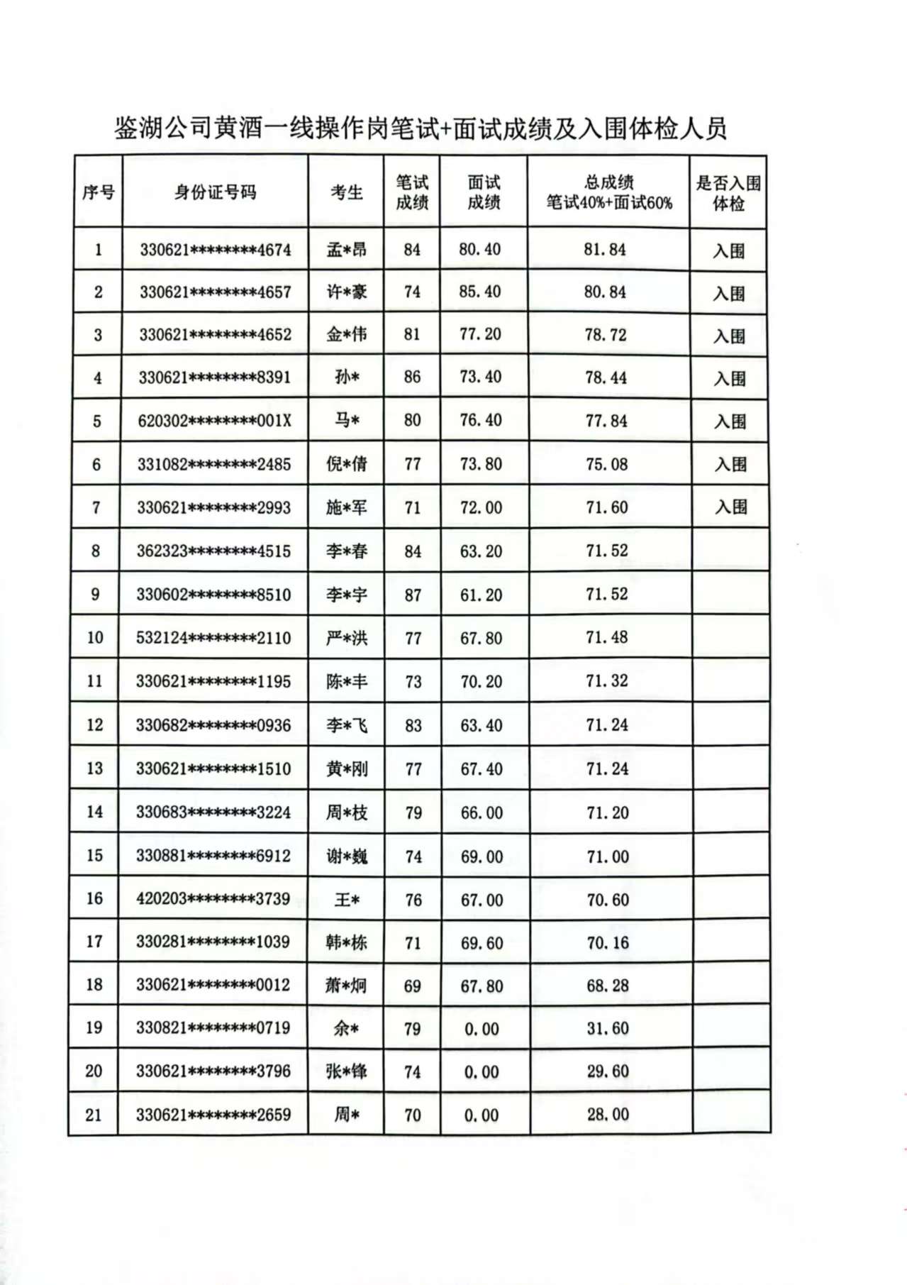 鉴湖公司黄酒一线操作岗笔试+面试成绩及入围体检人员