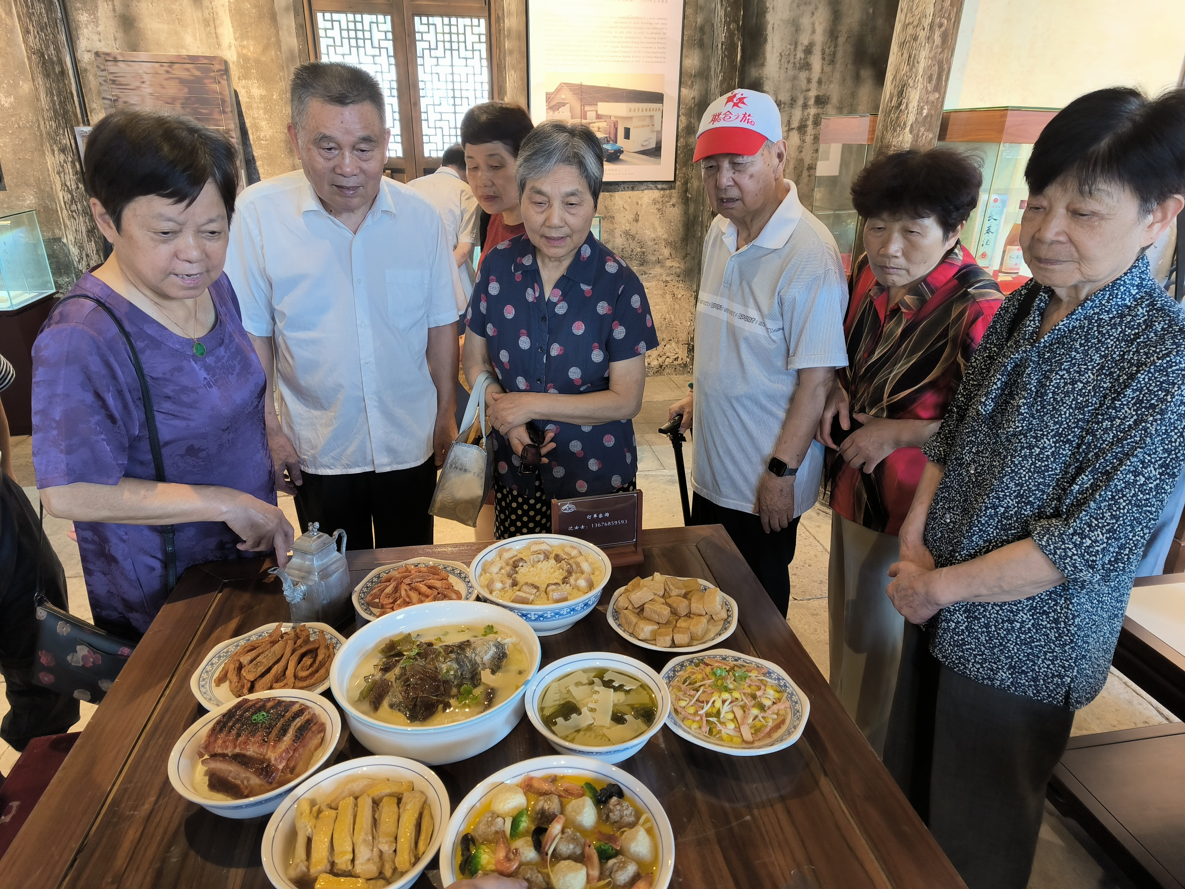 参观过程中,老同志们对网红美食“鉴湖十碗头”展现出了浓厚的兴趣。在看到“中国八大名酒”——鉴湖长春酒的相关介绍时,认为长春酒兼具历史价值与品质优势,应进一步加大宣传力度,让更多人了解这款佳酿。